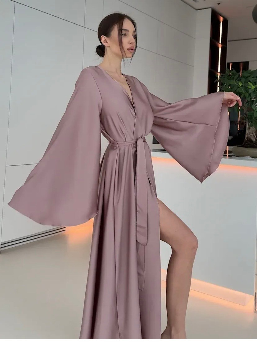 3-4 фото. Шелковый халат темно розовый. Он очень плотный, можно просто на белье надеть (только ткань очень гладкая поэтому, может раскрываться и надо будет поправлять. Либо можно надеть платье под него как на моей фотографии (цвет платья: черный, оливка, нежно голубой, молочный, жемчужный, латте)